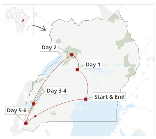 This Midrange safari takes you to the breathtaking national parks. It includes rhino trekking in Ziwa Rhino Sanctuary, a boat excursion at Murchison Falls, a visit to the top of the falls, and plenty of wildlife, including lions, buffalos, elephants, leopards and hippos, among other species and birds, on a game drive. The mountain gorillas trek in Bwindi forest after chimpanzees trek at kalinzu Forest.